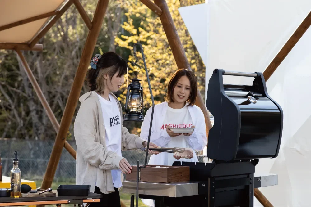 各ドームテントに専用の屋根付きBBQテラスと焚き火台を完備。プライベートな空間でバーベキューや焚き火を思う存分楽しめます。雨除けカーテン付きなので天候に左右されず、オールシーズン使用可能です。