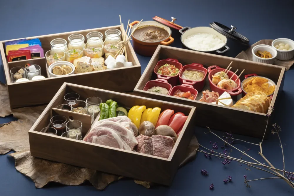 夕食は、一流シェフ監修の特製お重スタイルで提供。岐阜・恵那山麓の豊かな土壌が育んだ国産牛ステーキや新鮮な地元野菜などの厳選食材を、専用のWeberガスグリルでじっくりと焼き上げて楽しみます。